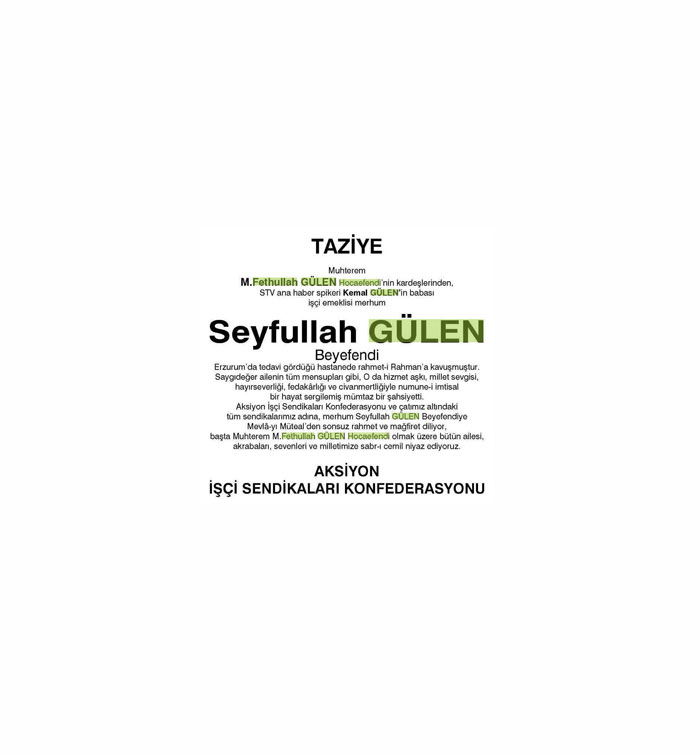 Fethullah Gülen Hocaefendi'nin kardeşi Seyfullah (Sibgatullah) Gülen, (72) Erzurum'da bir süredir tedavi gördüğü Özel Şifa Hastanesi'nde sabah saatlerinde vefat etti.