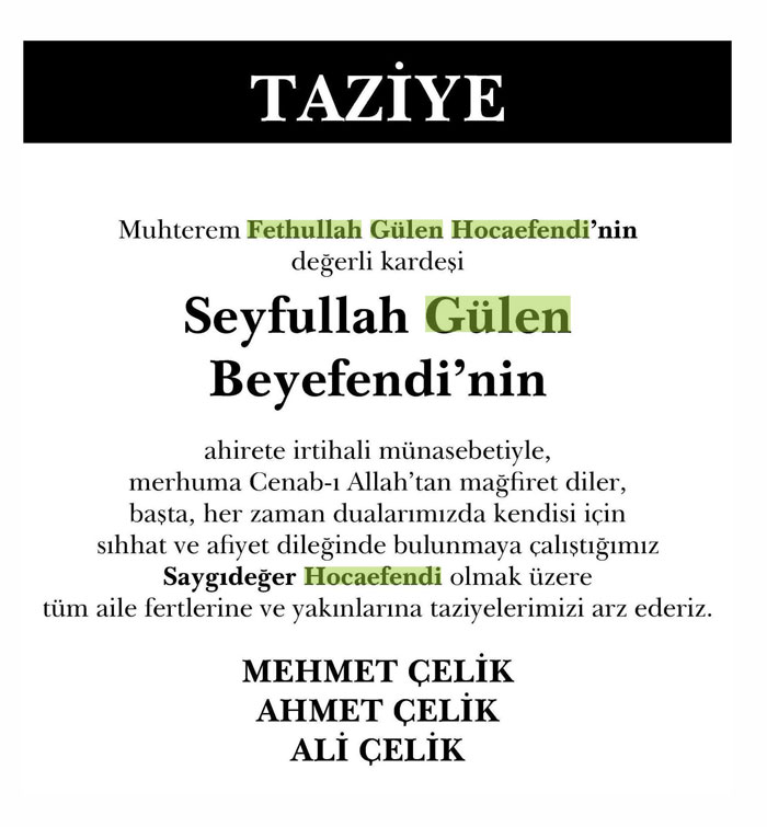 Gülen'in küçük kardeşi Mesih Gülen, ağabeyinin vefatı nedeniyle üzgün olduğunu söyledi. Muhterem Fethullan Gülen'in kardeşinin cenaze törenine katılmasını istemediğini de dile getiren Mesih Gülen, "Cenazenin defni için Hocaefendi'den haber bekliyoruz. Seyfulluh ağabeyimin çocukları buradaydı daha dün Amerika'ya gittiler. Babalarının iyileşip ayağa kalkacağından ümitliydiler." şeklinde konuştu.
