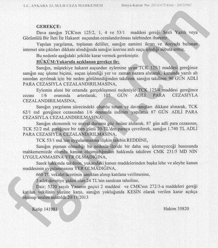 Mahkemenin gerekçeli kararında, "toplanan deliller, sanığın samimi ikrarı ve dosyadaki internet çıktıları dikkate alındığında, sanığın atılı suçu işlediğinin sübuta erdiği" kaydedilerek, bu nedenle T.K'nin, "sesli, yazılı veya görüntülü bir iletiyle hakaret" suçundan 87 gün adli para cezasına çarptırıldığı belirtildi.