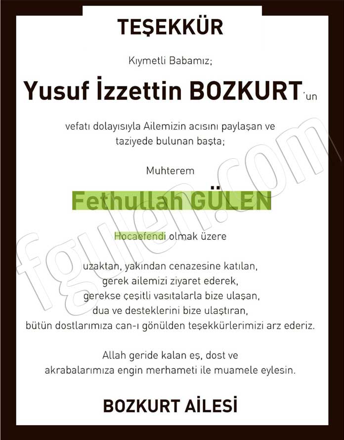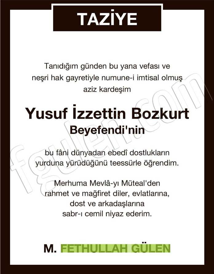 Tanıdığım günden bu yana vefası ve neşri hak gayretiyle numune-i imtisal olmuş aziz kardeşim Yusuf İzzettin Bozkurt Beyefendi’nin bu fâni dünyadan ebedî dostlukların yurduna yürüdüğünü teessürle öğrendim.